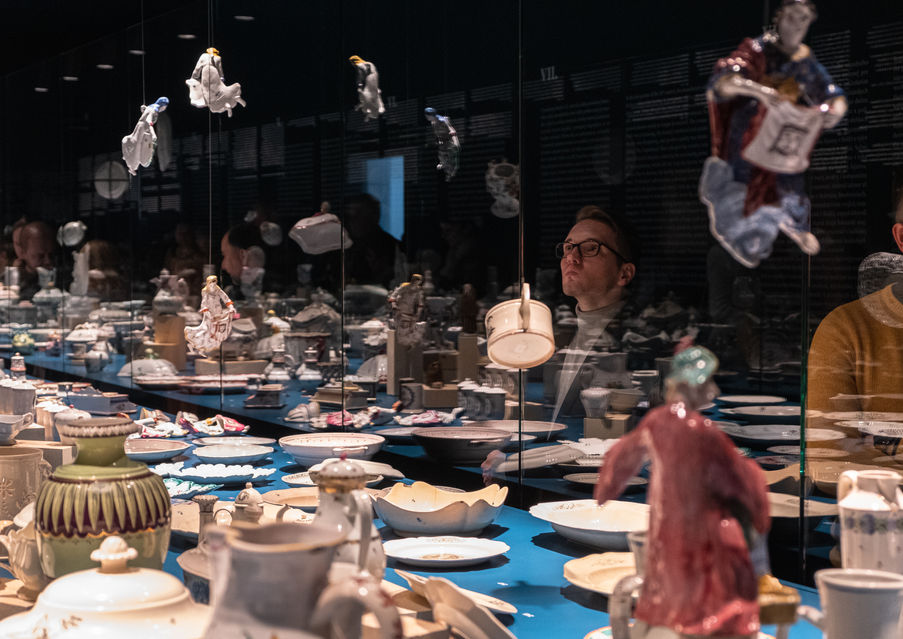 Základným priestorovým prvkom expozície je vyvýšený priestranný, 12 metrov dlhý stôl, ktorý je odkazom na prostredie manufaktúry. Hoci stôl je objekt, na ktorý keramika prirodzene patrí a kde ju očakávame, našim východiskom bol spôsob a proces jej výroby. Preto sú predmety inštalované v priestorových kompozíciách na šamotových tehlách. Vybrané významné exponáty zas "levitujú" nad stolom, pričom sme využili metaforu namáčania do glazúry.